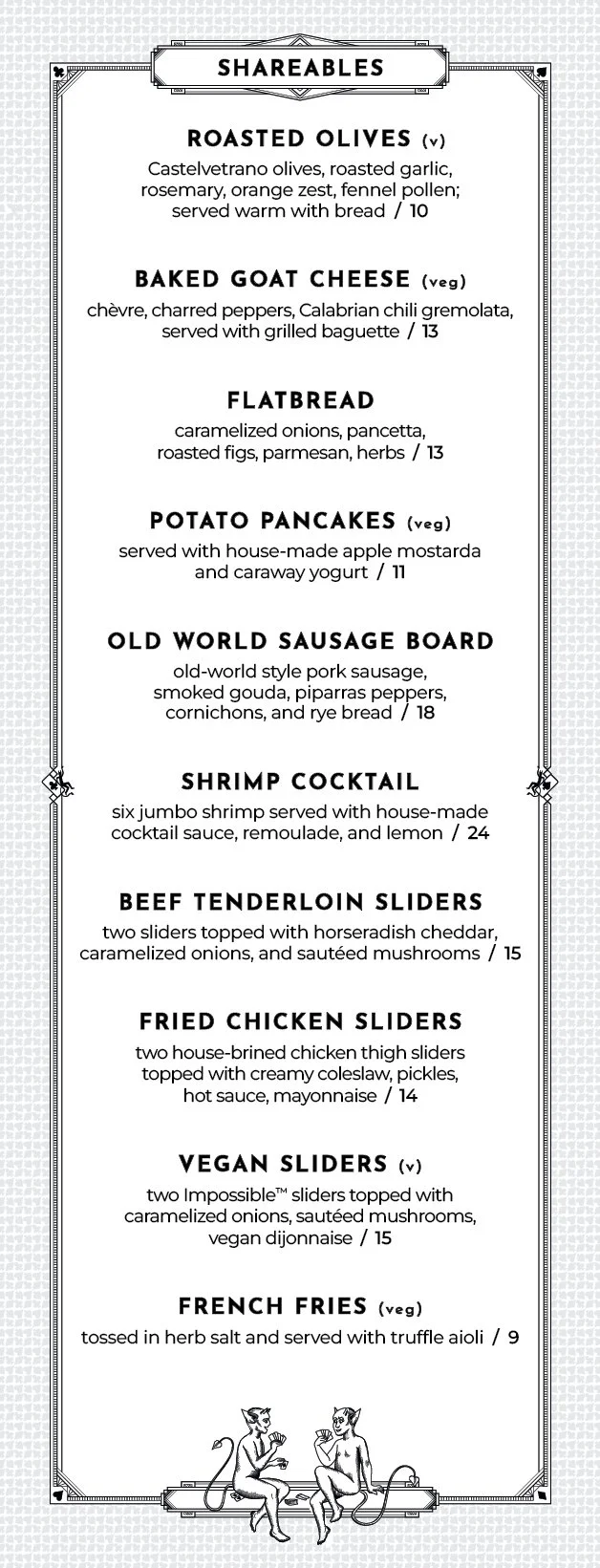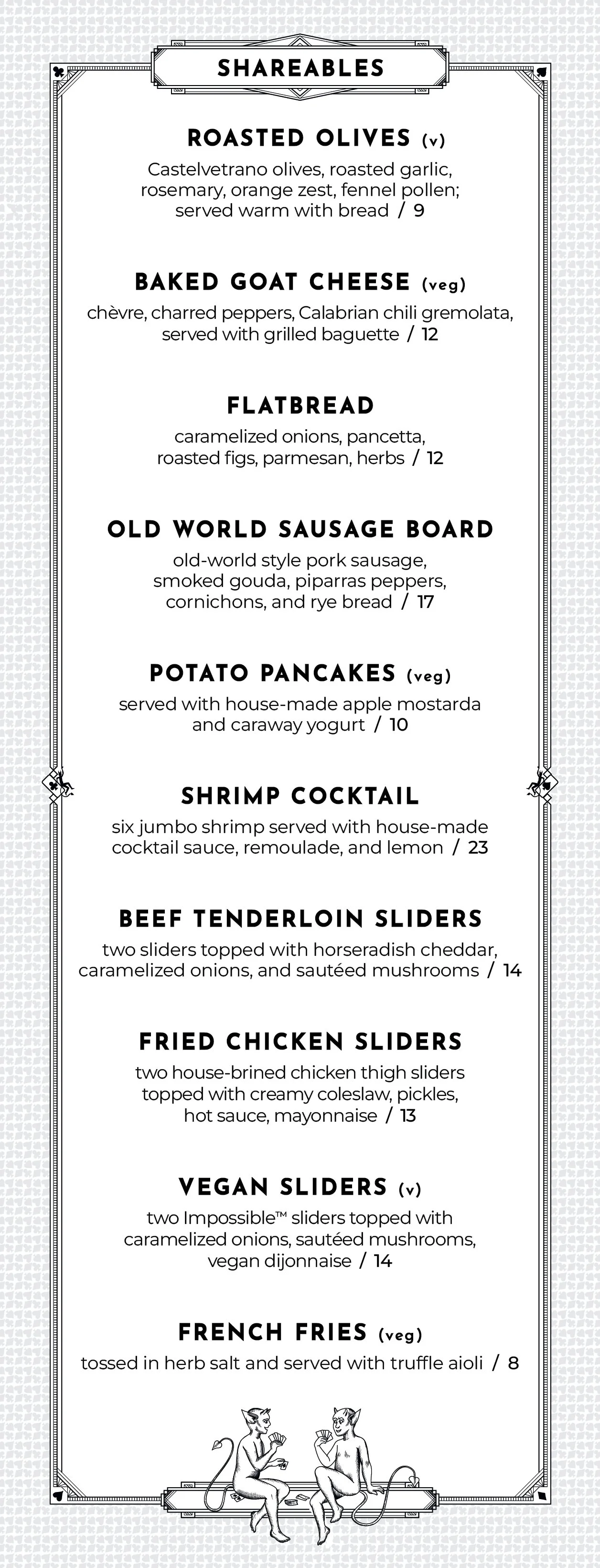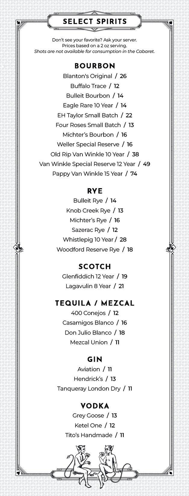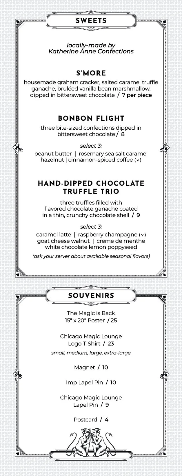 Enjoy finely crafted cocktails and delicious small plates in our Art Deco-style Speakeasy Performance Bar or at your cabaret table during the show. The Performance Bar opens to the public nightly at 5:00 pm and does not require a ticket to the show. The kitchen opens at 6:00 pm Monday through Saturday for the bar, and at 4:00 PM for The Signature Show matinee on Sunday. Full food and drink service is available in the Harry Blackstone Cabaret Theater throughout the show.